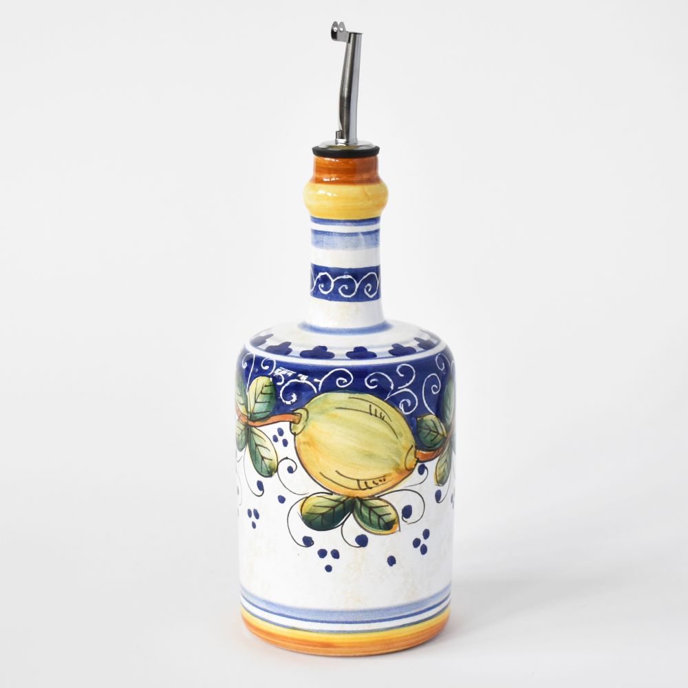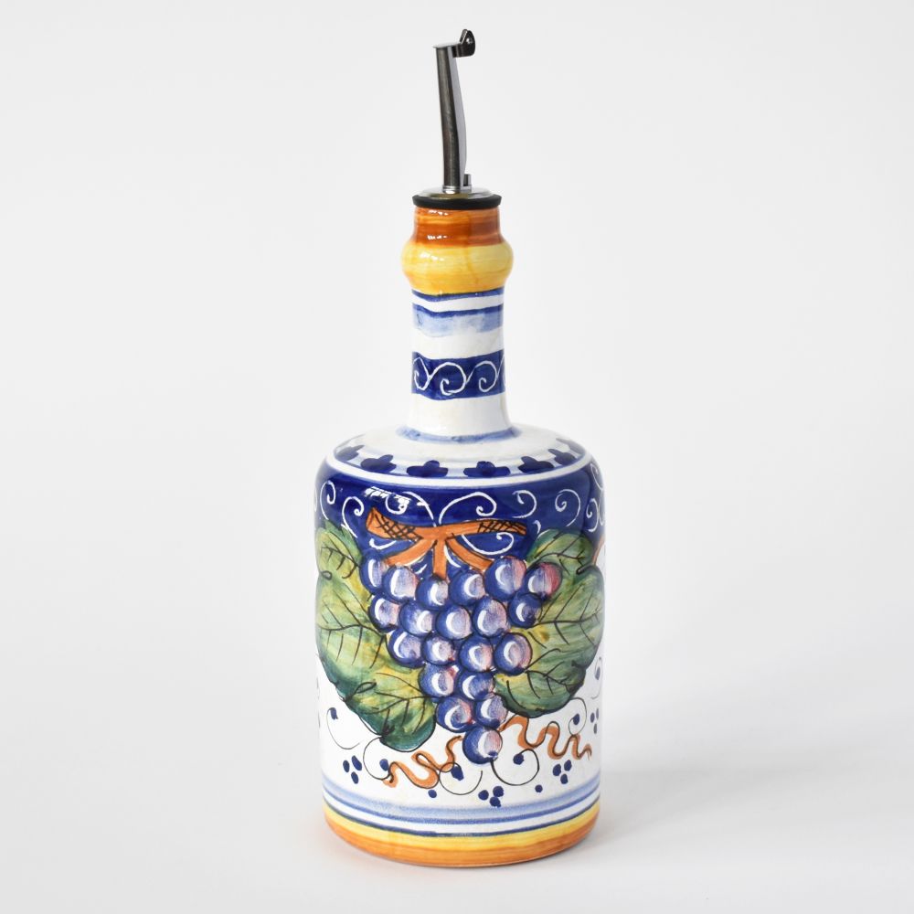 The unmistakably Italian Bacco grapes and lemon design is hand-painted on this essential countertop companion, the classic olio d'oliva cruet. Sized for kitchen convenience but elegant enough for the dining table, our majolica ceramic olive oil dispensers from Deruta, Italy, protect your oil from light, while the stainless steel spout ensures a steady and smooth pour.