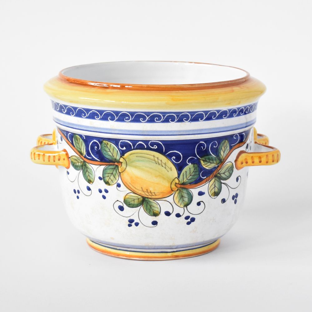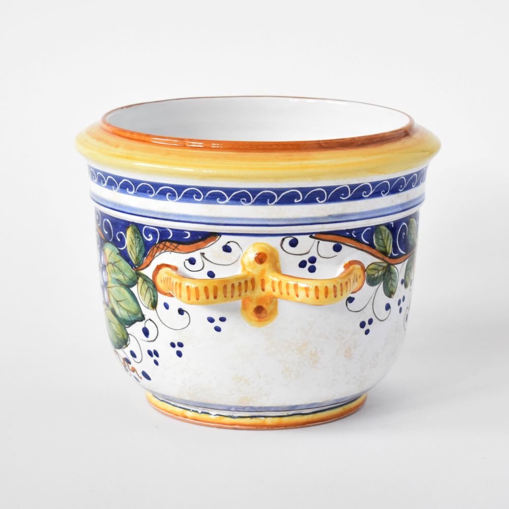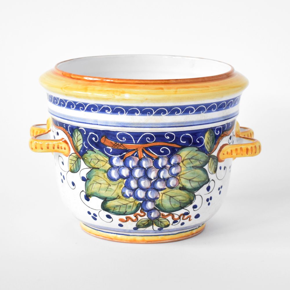 Fit for flowers, herbs, and all manner of houseplants, this sweet little majolica ceramic planter pot is handmade by artisans in Deruta, Italy. Bring a splash of unmistakably Italian decoration to any tabletop or countertop with the festive and colorful Bacco grapes and lemon pattern.
