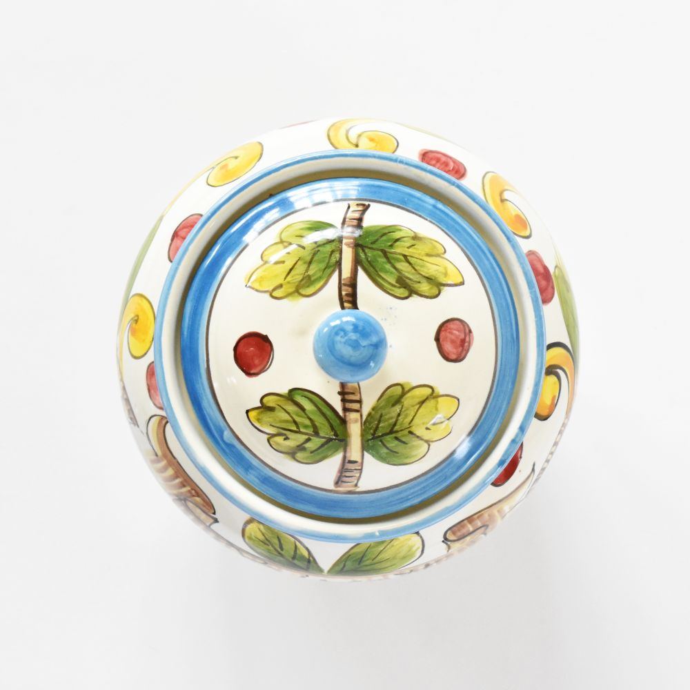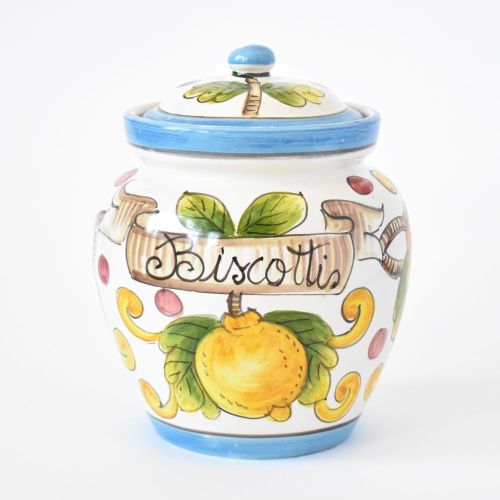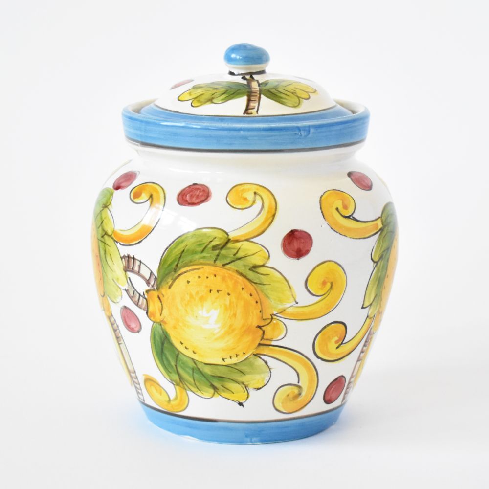 The neutral off-white background of Limoni fondo Bianco allows the cheerful lemons pattern to be the star of this trim and tidy jar. Whether it's a small space or an already-full countertop that calls for a compact biscotti container, this hand-painted ceramic cookie jar from Montelupo Fiorentino in Tuscany, Italy, will be a welcome and effortless addition to anyone's home!