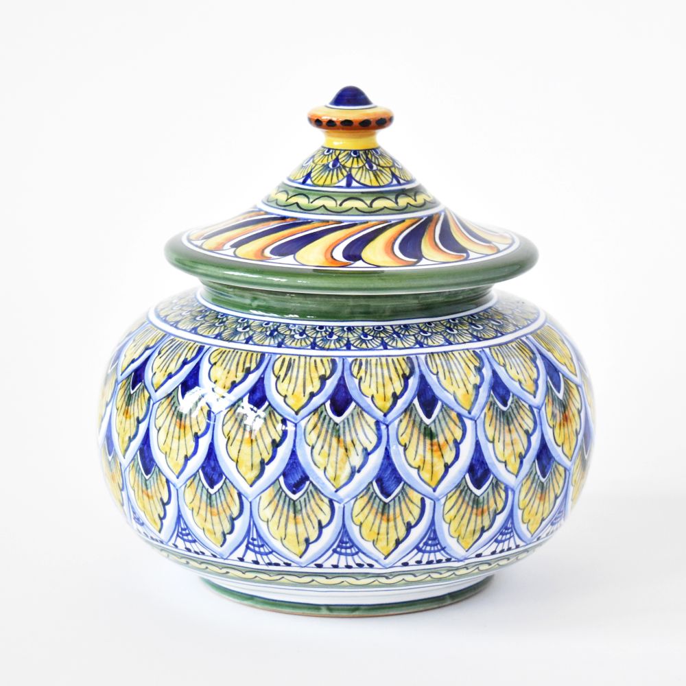 The striking and distinctive Pavone design of stylized peacock feathers covers this round handmade Italian ceramic cookie jar. Hand-painted by skilled artisans in Deruta, Italy, this covered jar will be a showstopper, whether filled with homemade sweets or Fido's favorite treats.