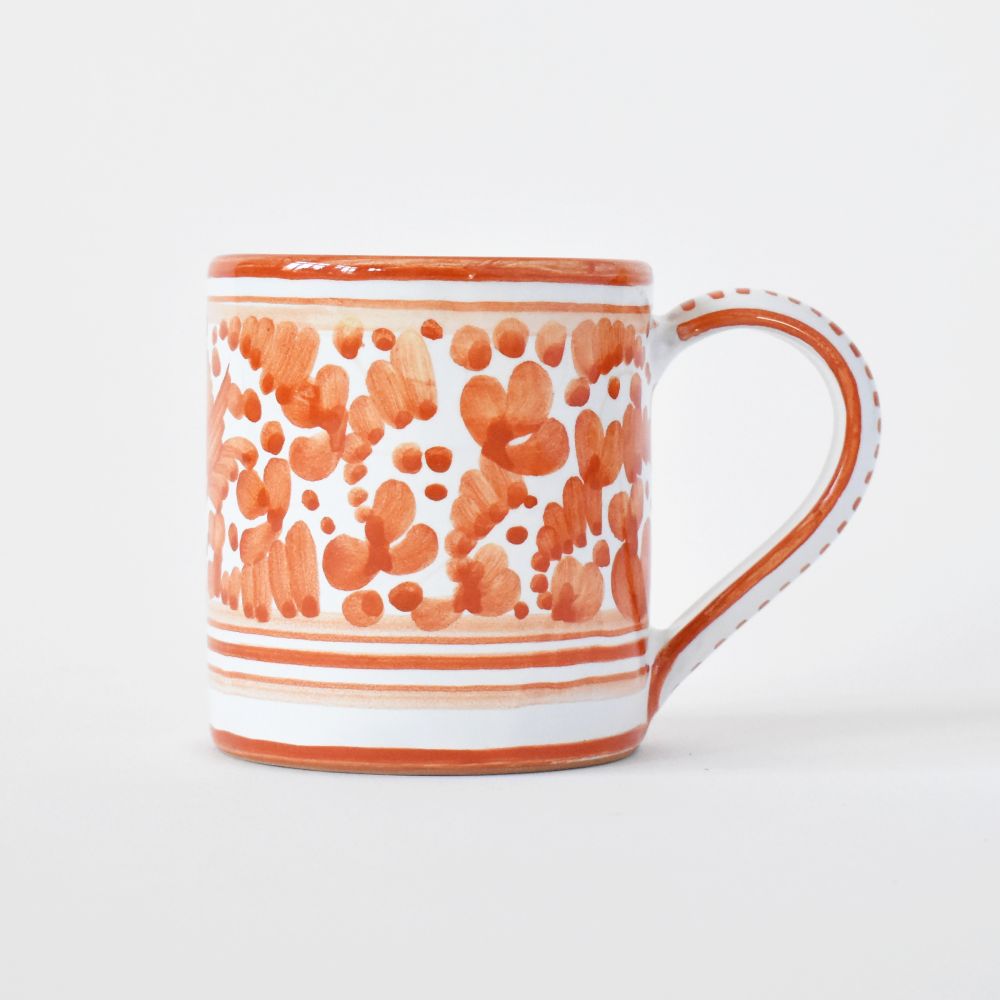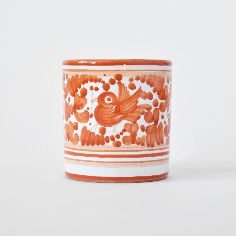 Sip your favorite warm beverage from this majolica ceramic cup, hand-painted in a bright and juicy orange version of the iconic Italian Arabesco bird design, handmade by skilled artisans in Deruta, Italy.