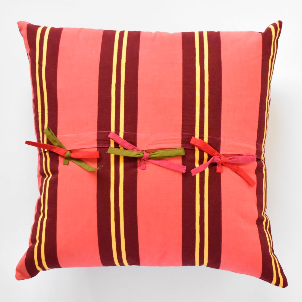 A midnight blue and yellow variegated stripe pairs with maroon elements to frame a field of deep pink and a single, delicate hibiscus flower on this printed cotton square pillow in Lisa Corti's Ibisco Green Pink design. Reversing to a wide stripe of geranium coral, maroon and yellow, this versatile throw cushion brings vibrant color to any seat or bed, and builds depth either alone or complemented by matching small accent pillows.