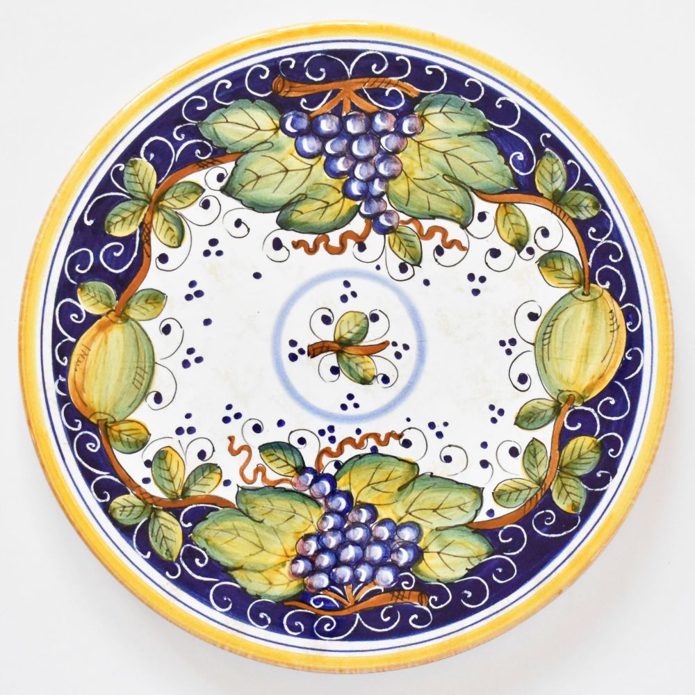 Present your next show-stopper dessert — or simply a few delicious cheeses — on this flat round ceramic serving plate in the festive and unmistakably Italian Bacco grapes and lemons design. Hand-crafted by artisans in Deruta, Italy, this versatile platter has a flat surface and wide base, allowing for stable cuts from edge to edge, making it indispensable on festive buffets and casual tabletops alike.