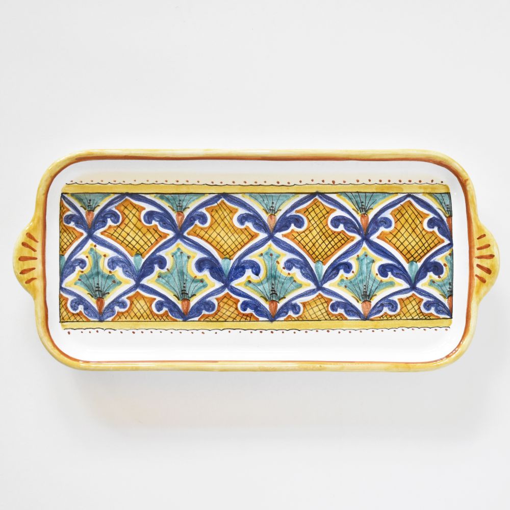 Hand-painted in the bold, peacock-inspired Squame design, this multi-purpose, full-size tray is handy for serving antipasto, corralling countertop essentials, and elevating vanity necessities. Crafted by artisans in Deruta, Italy, this majolica ceramic tray is a practical and colorful staple for any occasion.