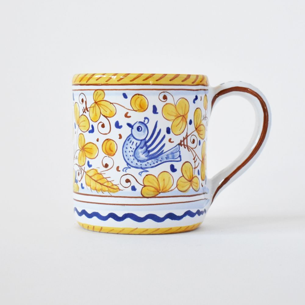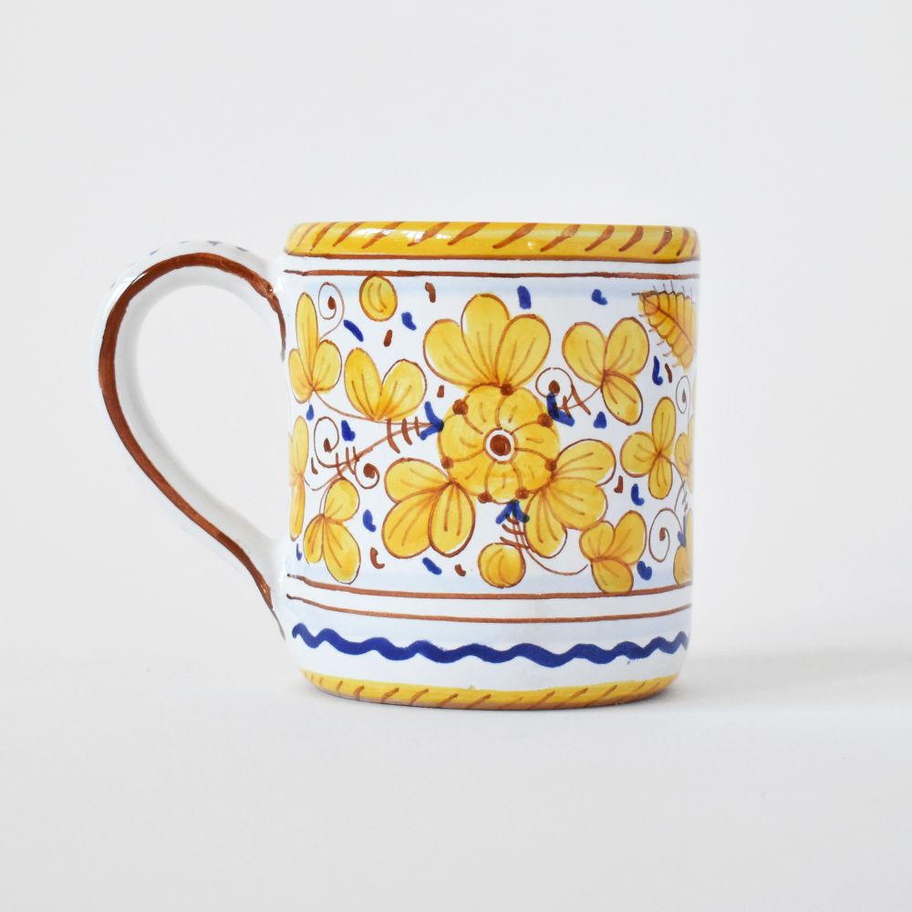 Sip your favorite warm beverage from this majolica ceramic cup, hand-painted in the charming Arabesco Giallo (yellow) design by skilled artisans in Deruta, Italy.