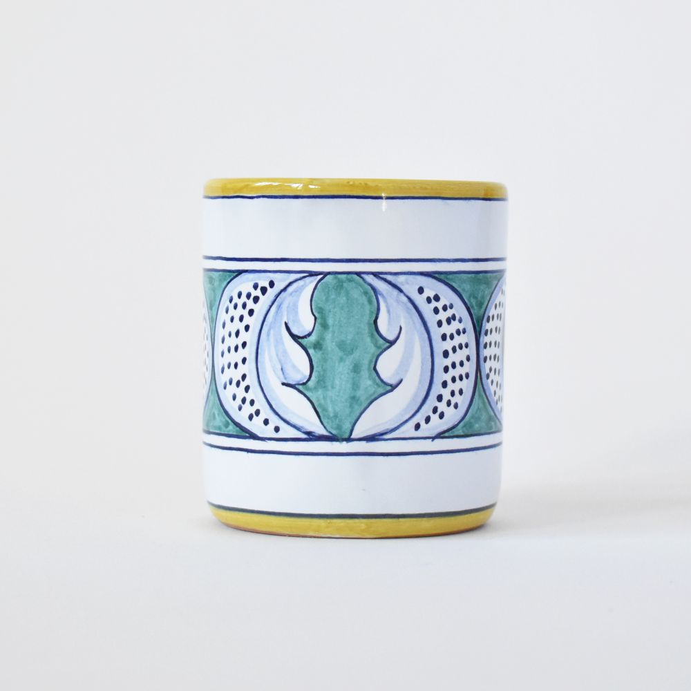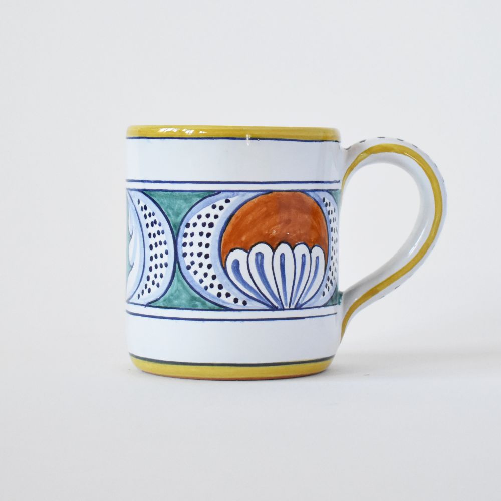 Sip your favorite warm beverage from this majolica ceramic cup, hand-painted in the crisp Etrusco design by skilled artisans in Deruta, Italy.